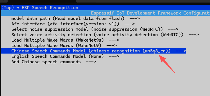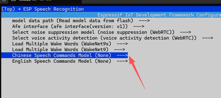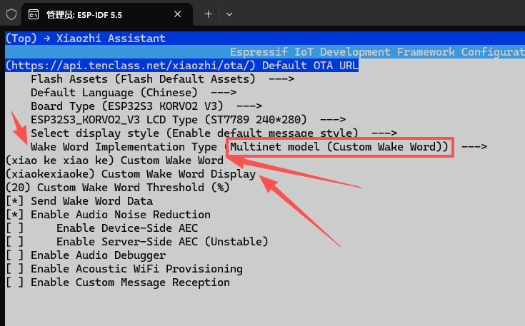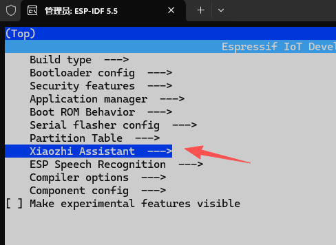 输入idf.py menuconfig进入配置界面,选择Xiaozhi Assistant