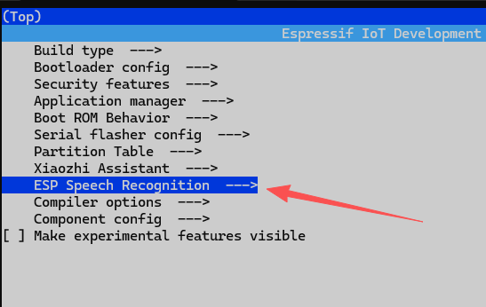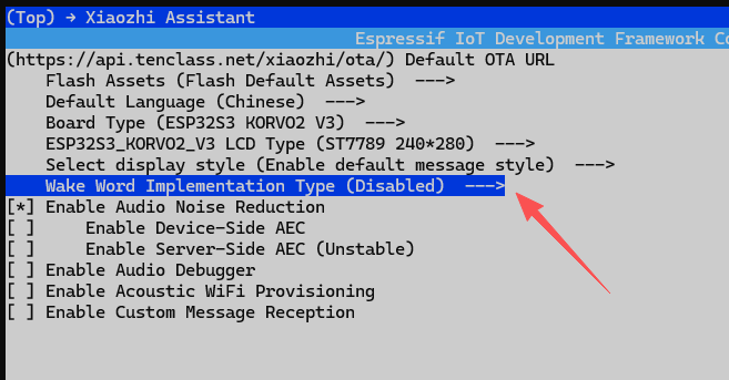 输入idf.py menuconfig进入配置界面,选择Xiaozhi Assistant